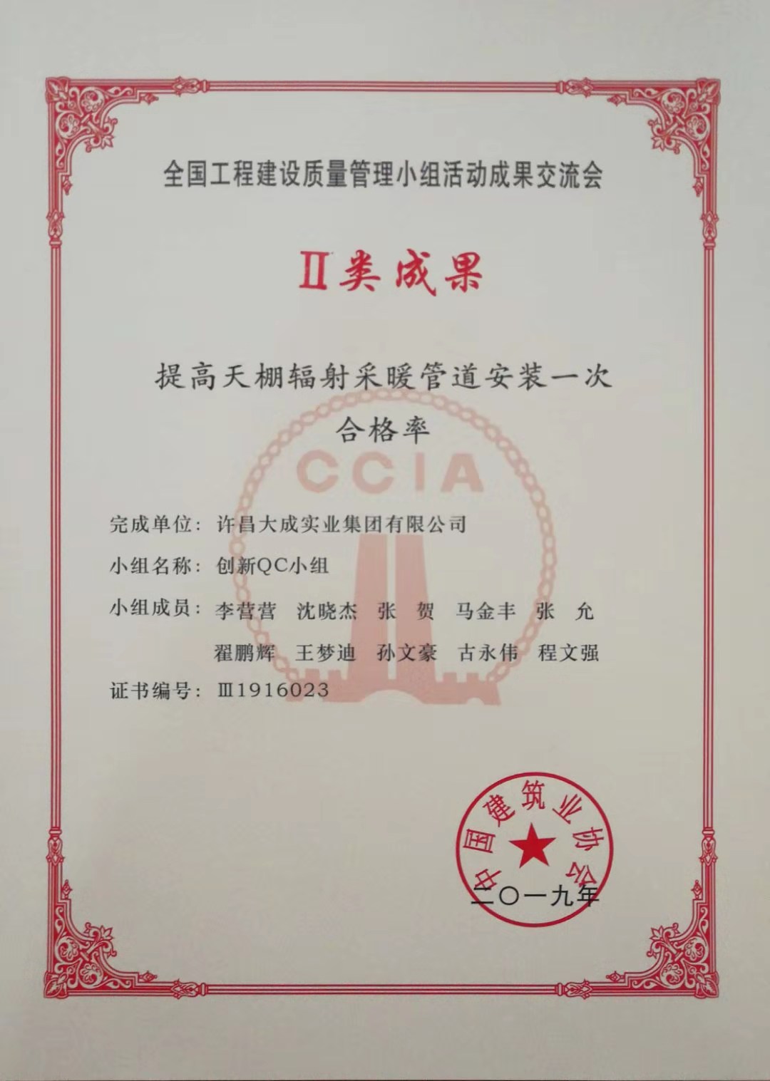 国家级优秀质量管理成果交流活动竞争非常激烈,每年全国各地推荐指标有限,成果质量要求较高。我公司两项成果在省内行业协会发布均为一等奖,作为河南省优秀质量管理成果被推荐参加国家级发布交流会,其中发布成果《提高天棚辐射采暖管道安装一次合格率》以选题新颖、活动记录完整、过程资料详实,得到了与会专家和行业同仁的肯定和认可,被汇编入《全国工程建设质量管理小组活动成果选编(2019)》中。交流成果《提高非固化橡胶沥青防水涂料与防水卷材复合施工一次验收合格率》也以PDCA程序正确、统计工具运用得当被认定为Ⅱ类成果。