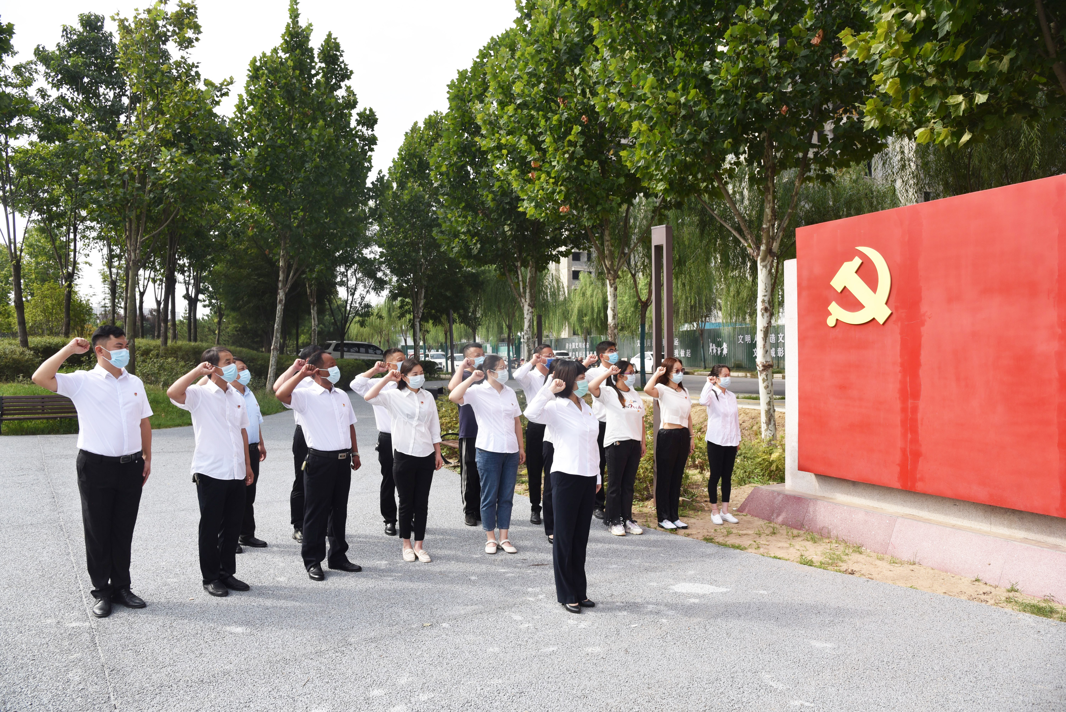 最后,参加活动的党员同志们在党建主题公园的和平广场西侧的党旗下,举起右手面向党旗重温了入党誓词。